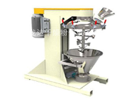 產品通過錐形混合腔頂部投入,投料范圍在30%-100%之間,設備中間有一個頂部驅動的高速轉軸,因此便去除了在產品區域的密封設計以及軸承。在軸上有緊貼內壁的槳式混合原件。通過高速旋轉的攪拌槳和錐形內倉的共同作用將產品由底部帶至混合腔的上部。當產品達到頂部的時候又重新回落到混合倉中心,如此的產品的方式形成了一種快速的宏觀混合。