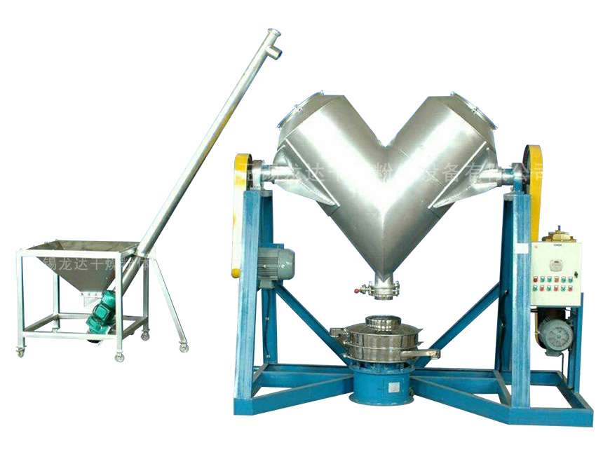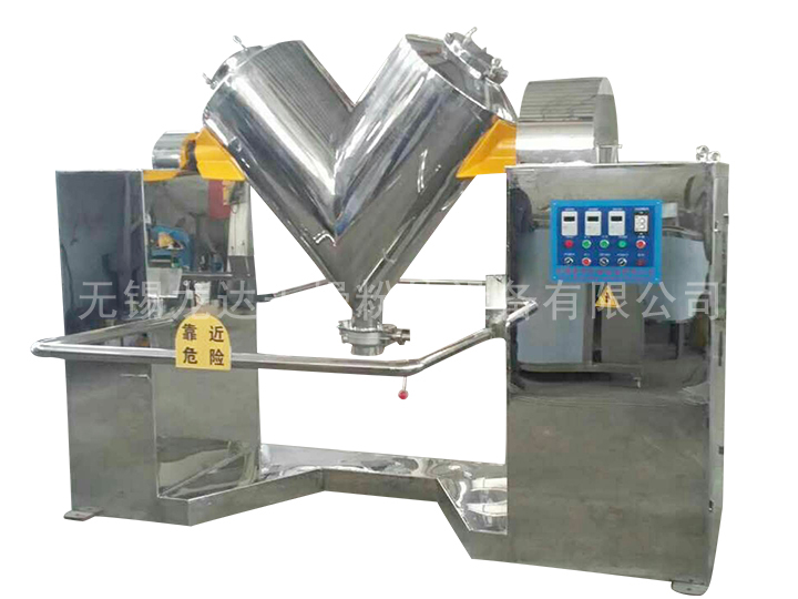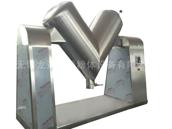 本機一端裝有電機與減速機,電機功率通過皮帶傳給減速機,減速機再通過聯軸器傳給V型桶。使V型桶連續運轉,帶動桶內物料在桶內上、下、左、右進行混合。